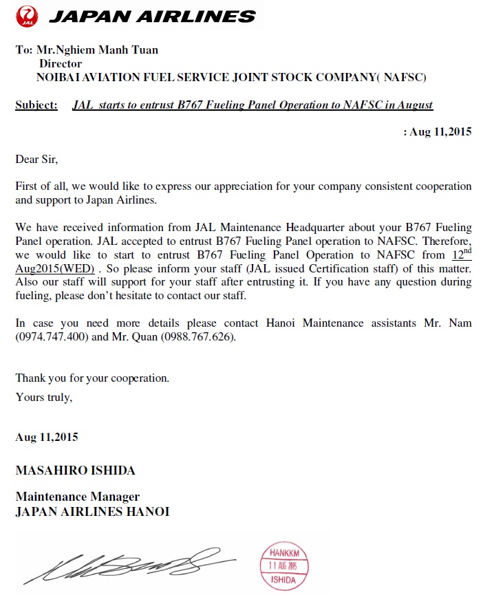 Ngày 11-08-2015, Mr. Masahiro Ishida - Trưởng phòng bảo trì của hãng Japan Airlines (JAL) tại Hà Nội, đã gửi thư xác nhận việc cấp chứng chỉ vận hành Panel B767 cho nhân viên tra nạp của NAFSC kể từ ngày 12-08-2015. Việc được phép vận hành panel của tàu B767 sẽ giúp nhân viên của NAFSC chủ động trong công việc đồng thời tiết kiệm được thời gian khi tra nạp cho JAL. Trong thời gian đầu, nhân viên của NAFSC sẽ nhận được sự hỗ trợ từ phía đội ngũ kỹ thuật của hãng JAL.