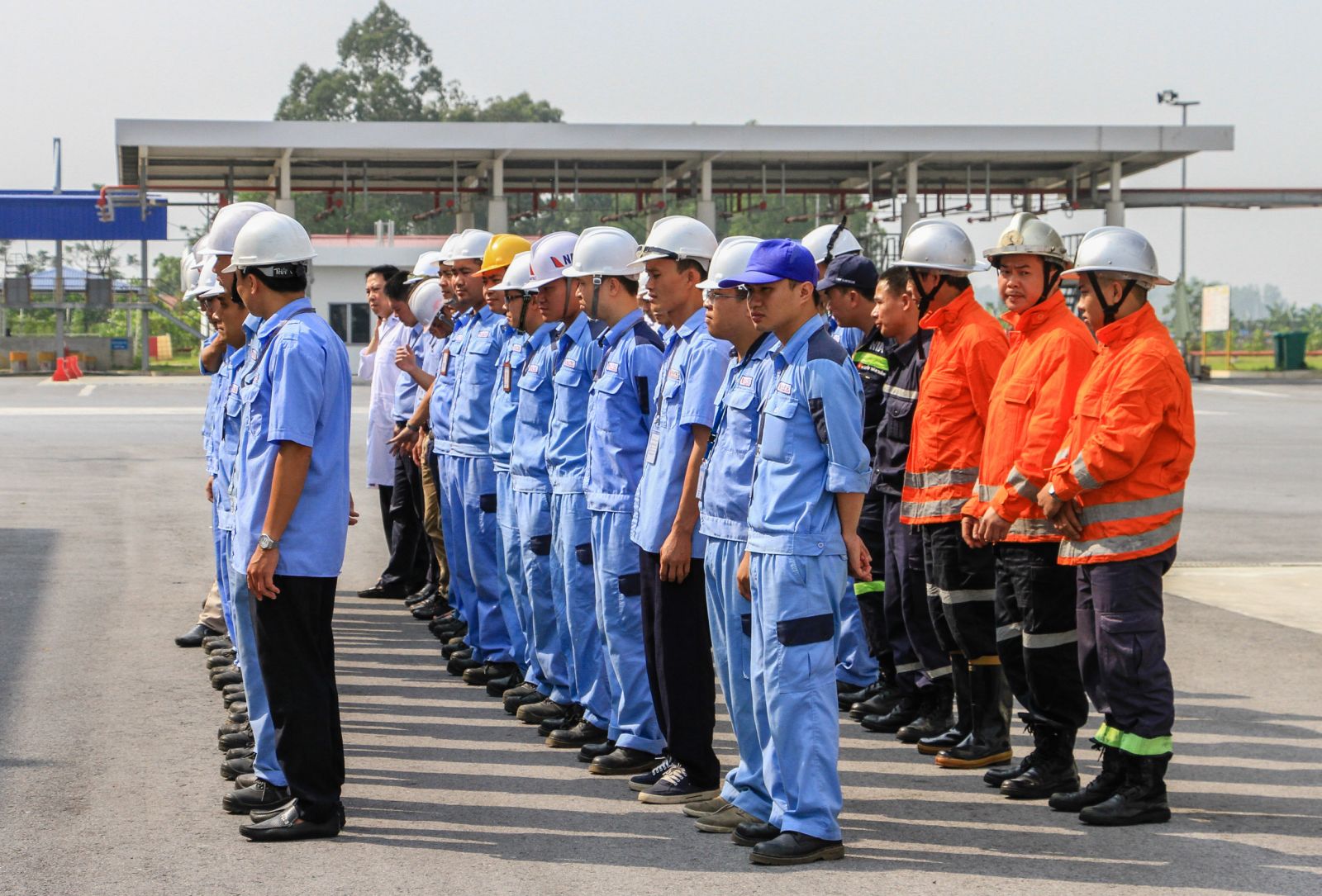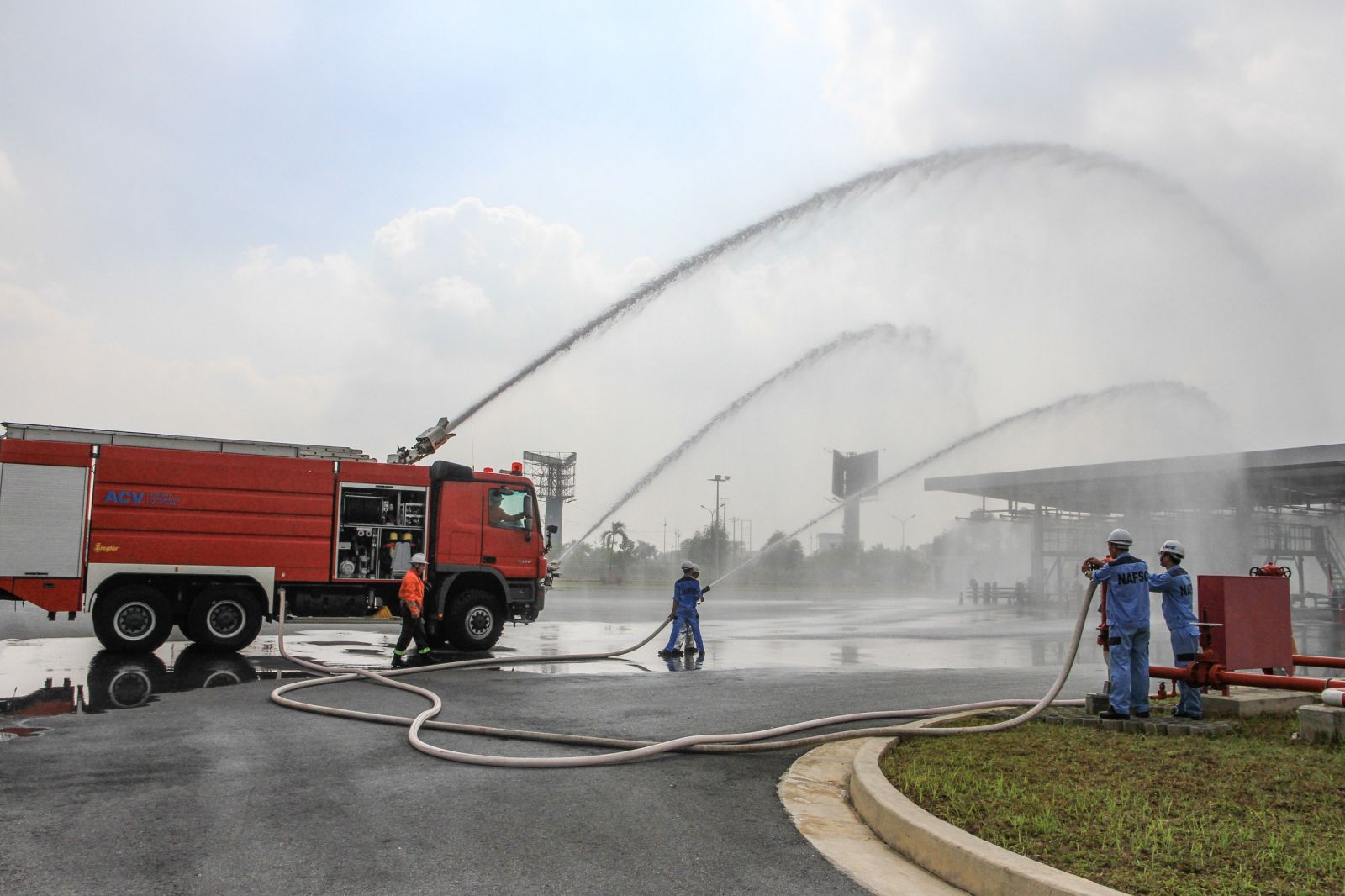 Các đội viên đội PCCC cơ sở và lực lượng khẩn nguy cảng HKQT Nội Bài