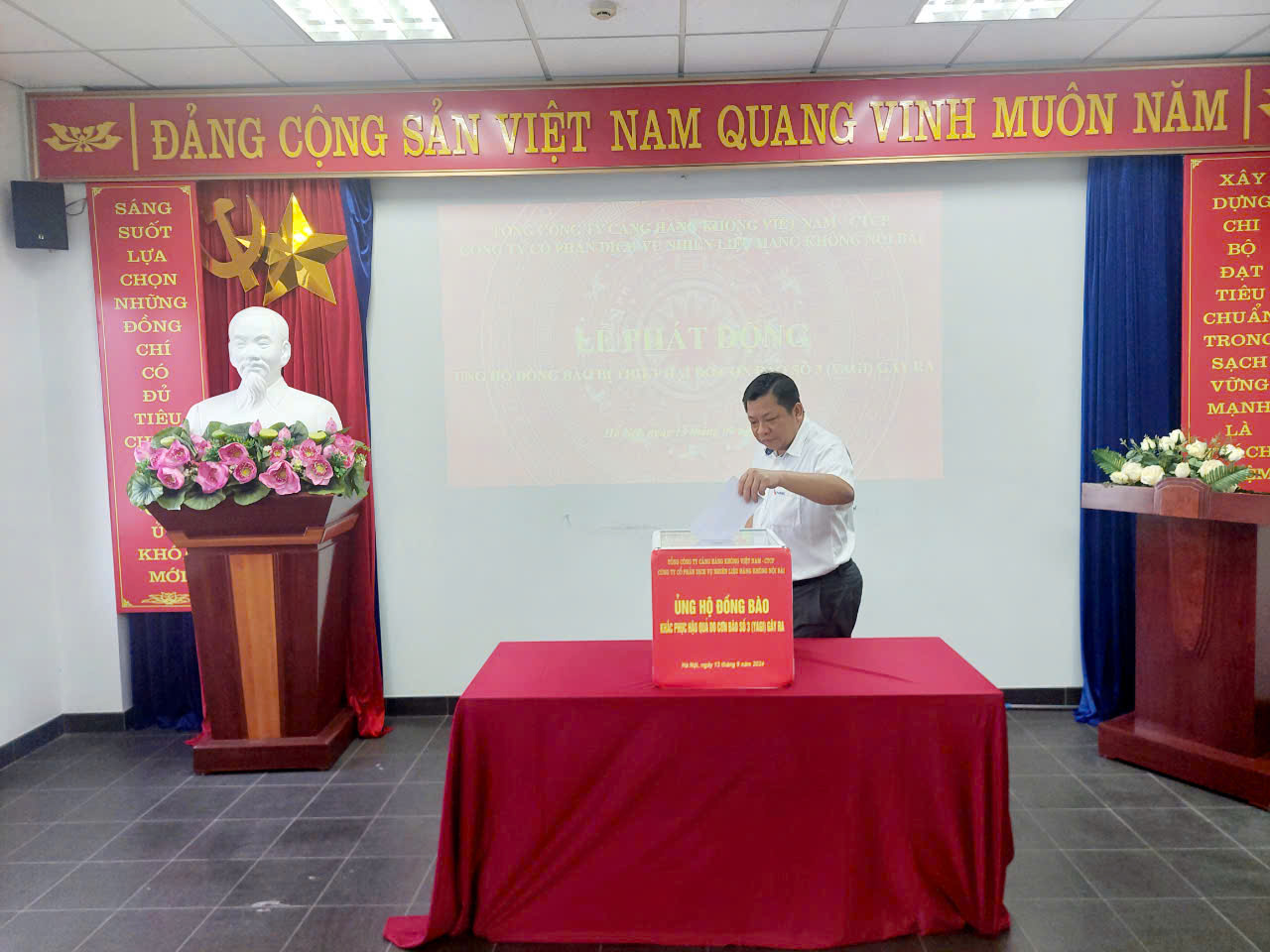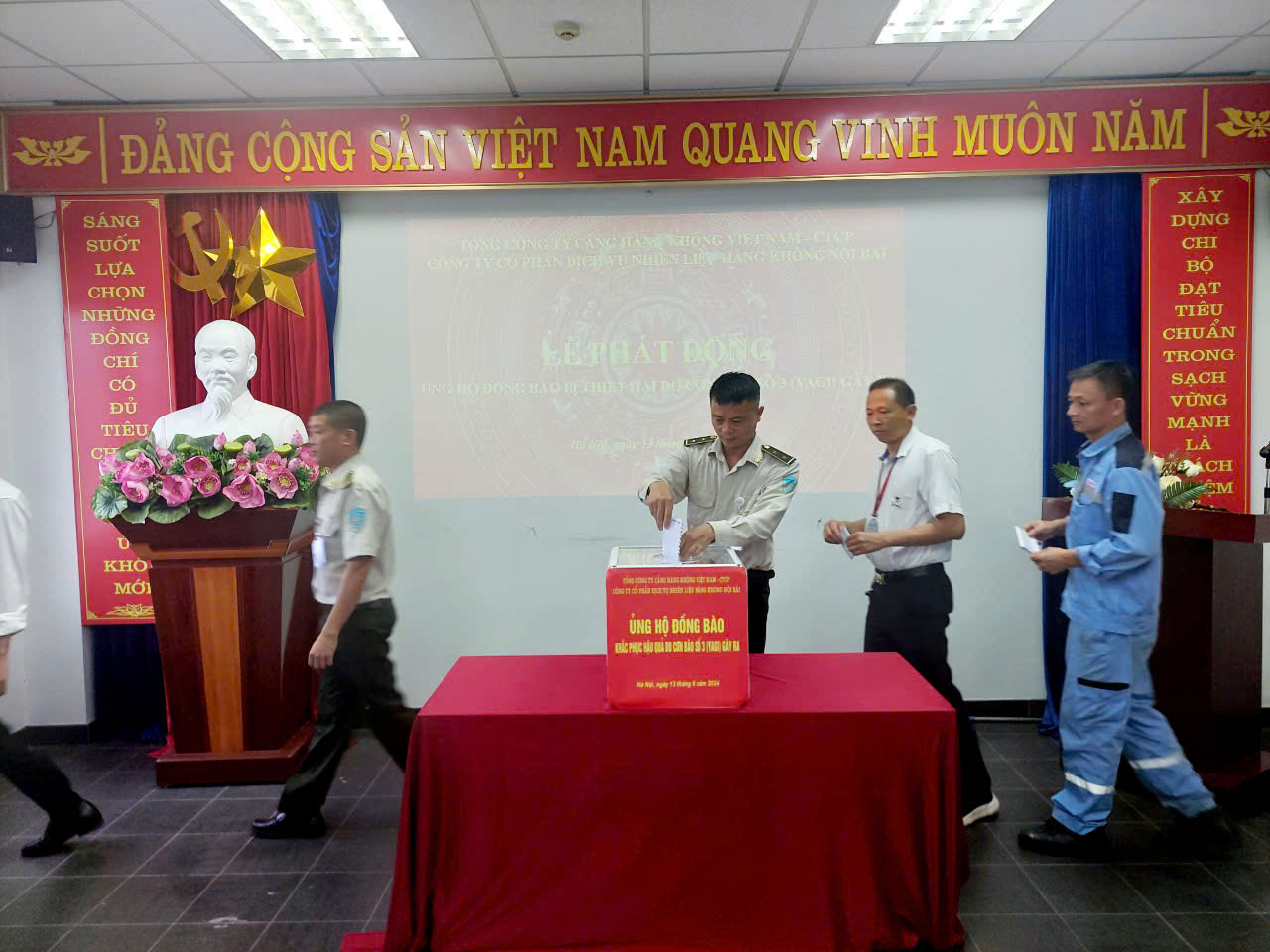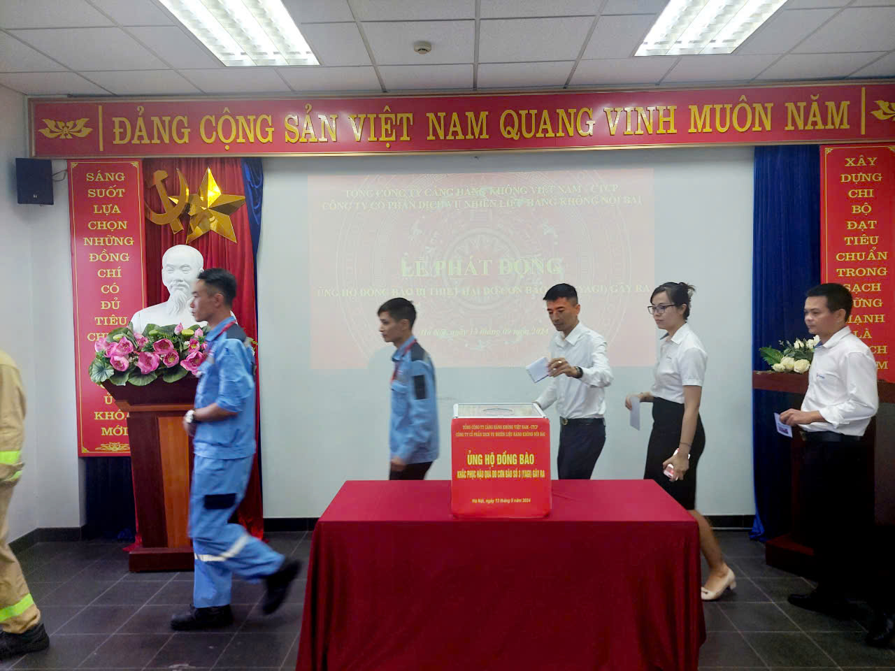 Bên cạnh đó, nhằm phát huy truyền thống “tương thân, tương ái”, “lá lành đùm lá rách”, với tinh thần “nhường cơm sẻ áo” cùng chung tay chia sẻ, ủng hộ đồng bào các tỉnh bị thiệt hại do bão, lũ, ngày 13/09/2024, cán bộ, nhân viên, người lao động Công ty cổ phần dịch vụ nhiên liệu hàng không Nội Bài đã tham gia ủng hộ trực tiếp tại buổi lễ phát động.