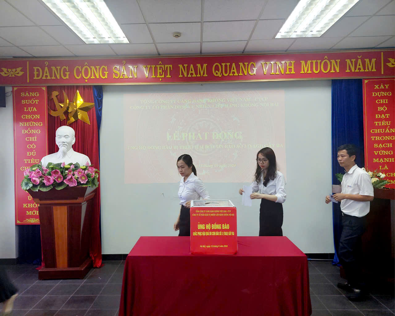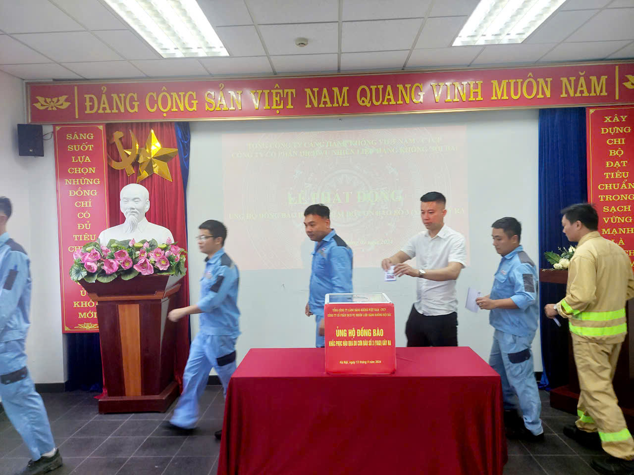Thực hiện Lời kêu gọi của Lãnh đạo Đảng, Nhà nước, Trung ương Mặt trận Tổ Quốc Việt Nam cũng như hưởng ứng Lễ phát động ủng hộ đồng bào bị thiệt hại do cơn bão số 3 gây ra của Tổng công ty Cảng hàng không Việt Nam – CTCP, Công ty cổ phần dịch vụ nhiên liệu hàng không Nội Bài đã kêu gọi toàn thể cán bộ, nhân viên, người lao động ủng hộ 01 ngày lương để quyên góp, ủng hộ Nhân dân vùng bị bão lũ, thiên tai.