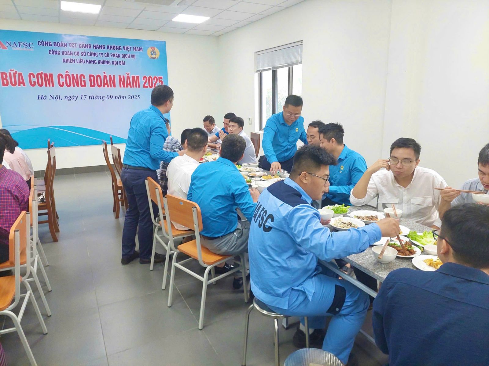 Thực hiện Hướng dẫn của Công đoàn Tổng công ty Cảng Hàng không Việt Nam về việc triển khai chương trình “Bữa cơm Công đoàn” năm 2025, ngày 17/09/2025 Công đoàn Công ty Cổ phần Dịch vụ Nhiên liệu Hàng không Nội Bài (NAFSC) đã tổ chức “Bữa ăn Công đoàn” đầy ý nghĩa dành cho đoàn viên, người lao động. “Bữa cơm Công đoàn” không chỉ là một hoạt động thiết thực chăm lo đời sống vật chất, tinh thần cho đoàn viên, người lao động, mà còn là lời tri ân sâu sắc, ghi nhận những đóng góp bền bỉ, thầm lặng của đội ngũ cán bộ, nhân viên tại Công ty NAFSC.
