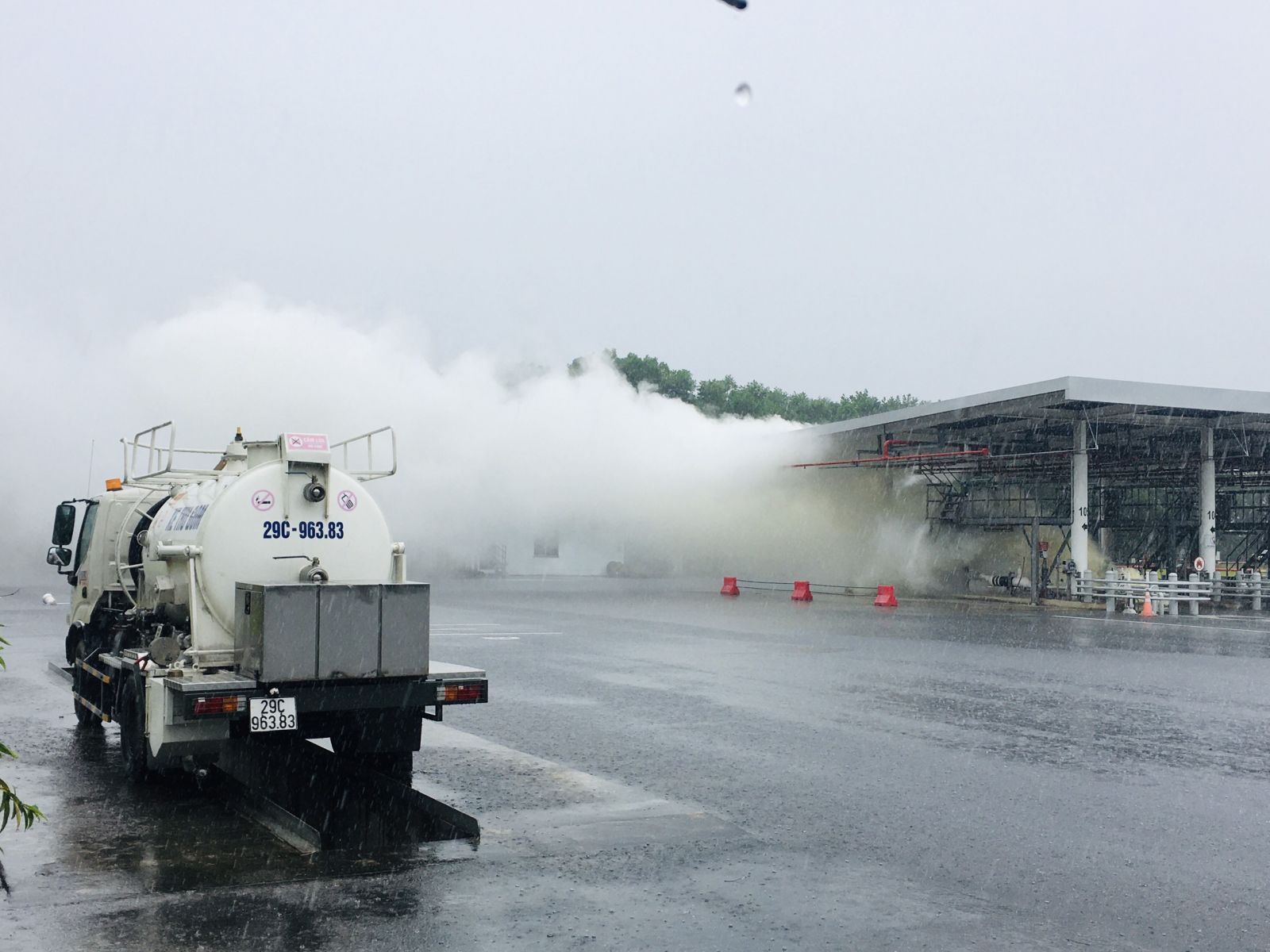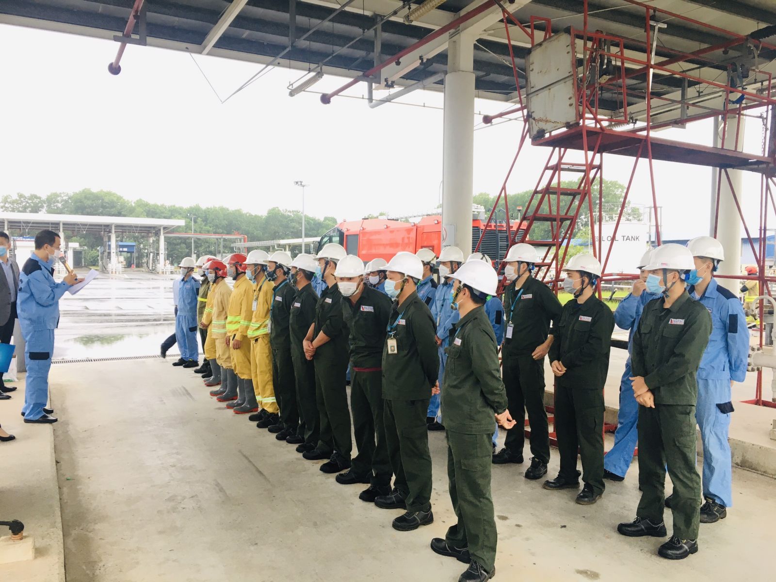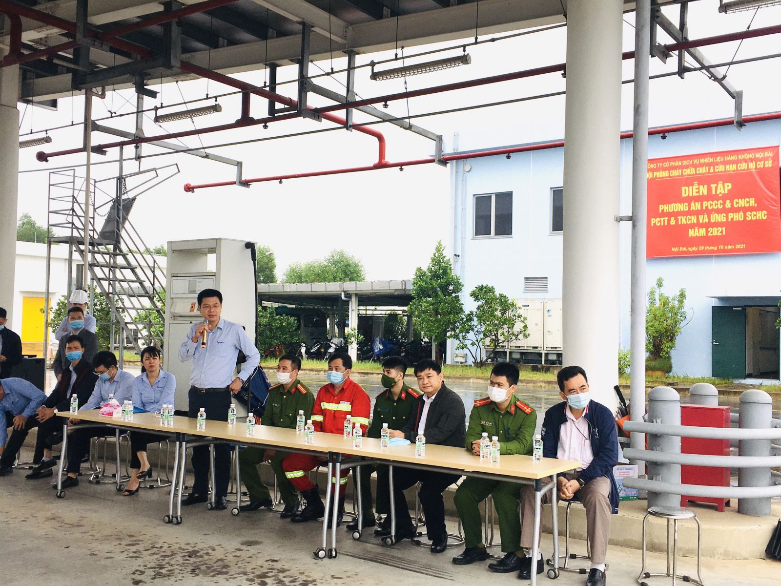Tình huống giả định là khi đang tiếp nhận dưới điều kiện trời mưa kèm theo sét, ống kết nối với xe bồn bị tuột ra làm tràn dầu, dẫn tới đám cháy xảy ra tại khu vực làn tiếp nhận số 05. Ngay khi có tín hiệu báo cháy, đội PCCC cơ sở đã nhanh chóng triển khai phương án chữa cháy với phương châm 4 tại chỗ để tạm thời khống chế ngọn lửa và giải cứu nạn nhân ra khỏi đám cháy. Bộ phận trực DCS đã gọi điện thông báo cho Ban chỉ huy khẩn nguy Cảng HKQT Nội Bài để được tiếp ứng kịp thời.