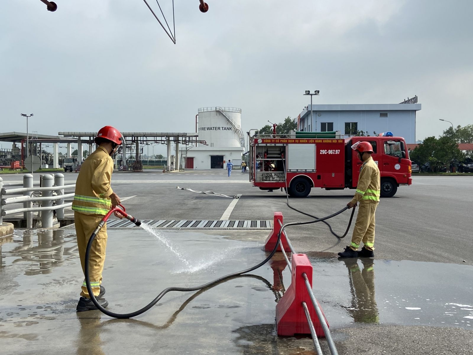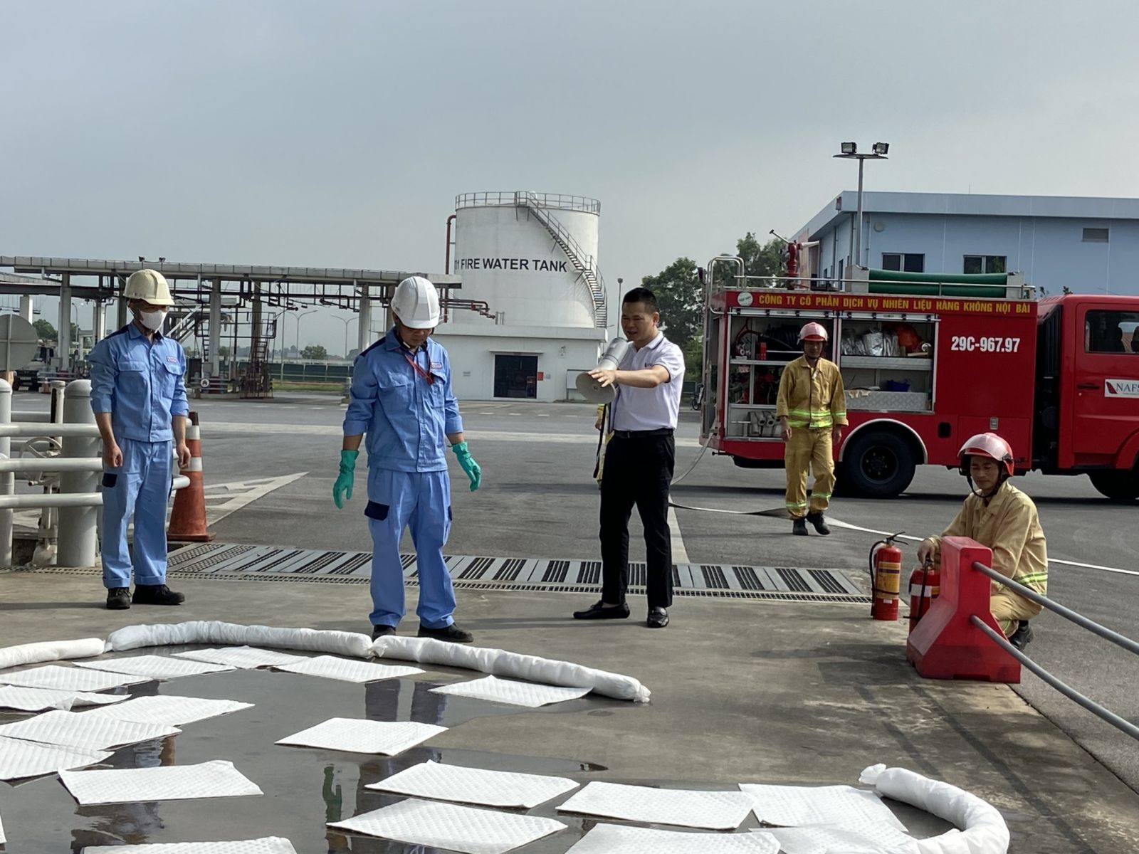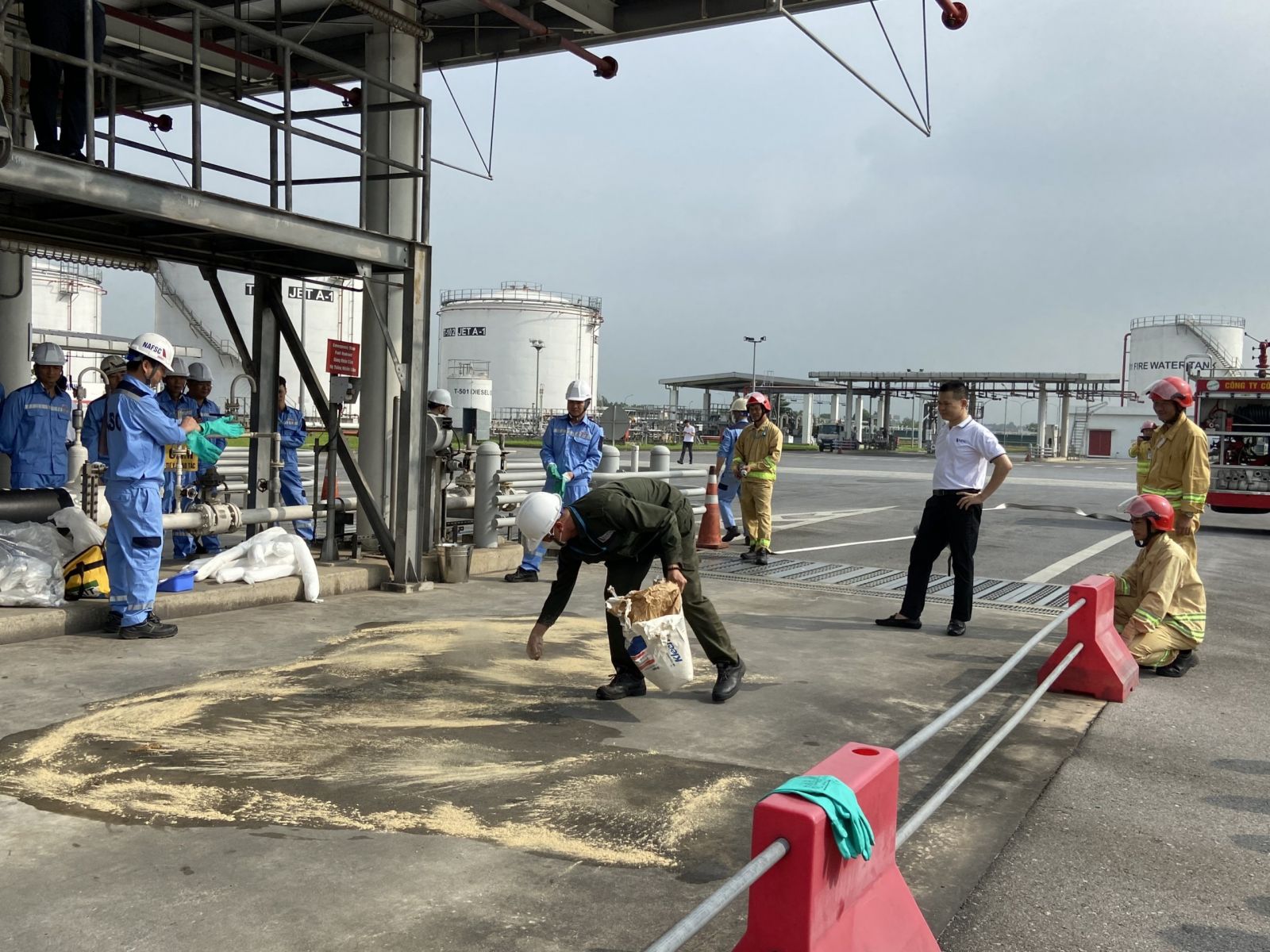 Tình huống giả định trong đợt diễn tập lần này là nhiên liệu bị tràn ra trong quá trình tiếp nhận, khối lượng dầu tràn ra nền làn nhập ước tính khoảng 700 lít, diện tích 4m2 gây nguy cơ mất an toàn cho nhân viên đang làm việc tại hiện trường.